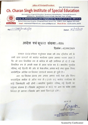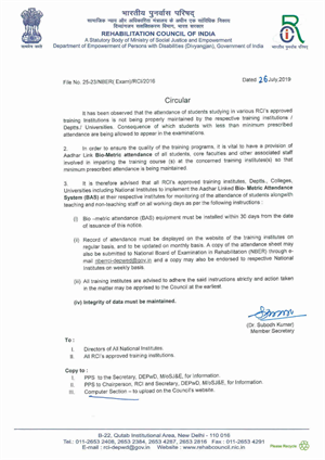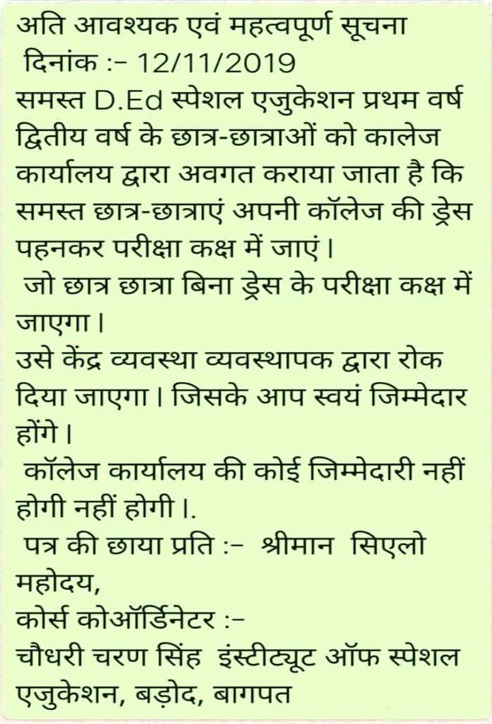 D.Ed special education first year and second year notice regarding to biometric attendance order of rehabilitation Council of India, New Delhi...